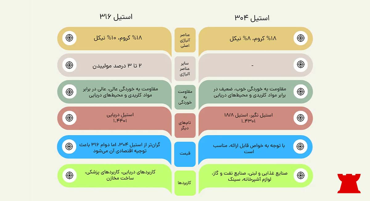 - قیمت استیل 316 حدود ۲۰ تا ۳۰٪ بالاتر از 304 است.
