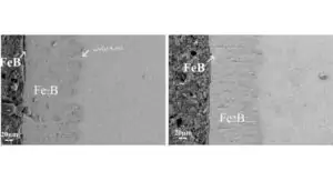 • اثرات ریزساختاری: تشکیل فازهای بوراید باعث ایجاد سطحی با سختی بالا می‌شود. به‌عنوان مثال، برای فولاد معمولی، سختی Fe₂B تقریبا 1500 HV و برای FeB حدود 1800 تا 1900 HV گزارش شده است. این سختی فوق‌العاده موجب مقاومت بسیار بالا در برابر سایش، خوردگی و خستگی سطح می‌شود. علاوه بر این، لایه بوراید حاصل، حتی در دماهای بالا، سختی خود را تا حد زیادی حفظ می‌کند.