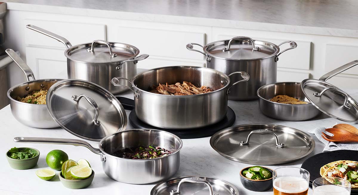 - KitchenAid بیشتر با لوازم برقی آشپزخانه شناخته میشود، اما سرویس استیل 3-ply آنها گزینهای حرفه ای برای آشپزخانههای مدرن است.